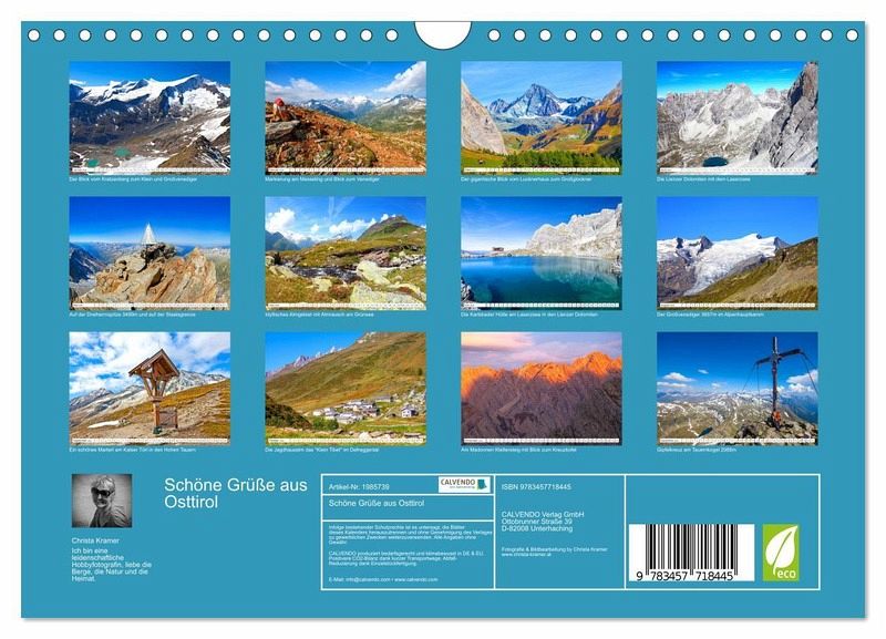 QUALITÄT - Hochwertiger Fotokalender mit 12 wunderschönen Motiven auf lichtbeständigem Bilderdruckpapier, robuste Spiralbindung mit Aufhängebügel.NACHHALTIG - deutliche Abfallreduzierung durch bedarfsgerechte Einzelstückfertigung, umweltfreundliches FSC-zertifiziertes Papier, Produktion in Deutschland, klimabewusste Logistik.PERFEKTES GESCHENK - Kalender für Freunde und Familie, für Kinder und Erwachsene, jung und alt, zu Weihnachten, Geburtstag oder zwischendurch.VIELFALT - Bildkalender in verschiedenen Formaten, z.B. DIN A5, DIN A4, DIN A3 sowie DIN A2. Ob Naturmotiv, Gemälde oder Fotos, ideal für ein persönliches Wohlfühlambiente.Impressionen einer faszinierenden Bergwelt mit Naturjuwelen aus Osttirol von Autor(in): Christa Kramer