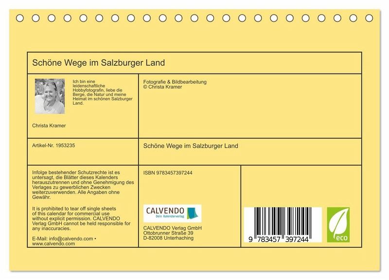QUALITÄT - Hochwertiger Fotokalender mit 12 wunderschönen Motiven auf lichtbeständigem Bilderdruckpapier, robuste Spiralbindung.NACHHALTIG - deutliche Abfallreduzierung durch bedarfsgerechte Einzelstückfertigung, umweltfreundliches FSC-zertifiziertes Papier, Produktion in Deutschland, klimabewusste Logistik.PERFEKTES GESCHENK - Kalender für Freunde und Familie, für Kinder und Erwachsene, jung und alt, zu Weihnachten, Geburtstag oder zwischendurch.VIELFALT - Bildkalender in verschiedenen Formaten, z.B. DIN A5, DIN A4, DIN A3 sowie DIN A2. Ob Naturmotiv, Gemälde oder Fotos, ideal für ein persönliches Wohlfühlambiente.Wunderschöne Wege in den vier Jahreszeiten im Salzburger Land von Autor(in): Christa Kramer