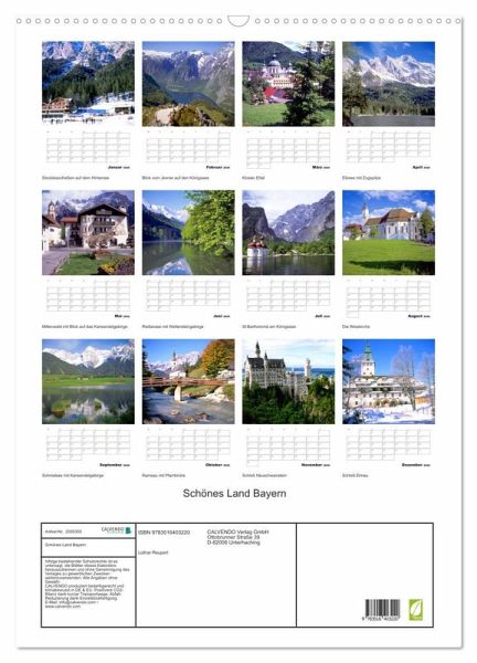 Dieser Kalender zeigt Bayern von seiner schönsten Seite. Besonders reizvolle Landschaften, Berge, Seen und weltbekannte Sehenswürdigkeiten sind zu sehen.