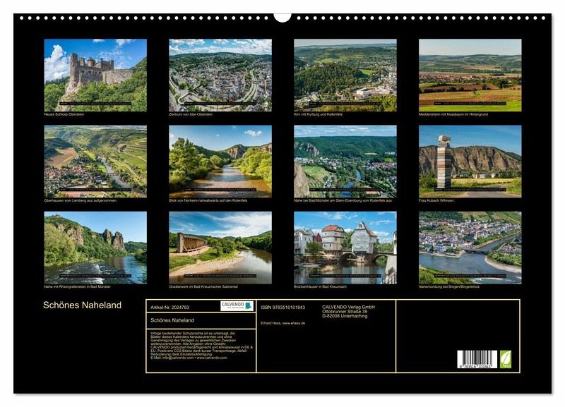 Das Naheland, ein Kleinod zwischen Hunsrück und dem Nordpfälzer Bergland, ist vielen noch nicht hinreichend bekannt. Doch gibt es eine ganze Reihe von Sehenswürdigkeiten, ob historische Bauten, Städte, Kulturlandschaften mit Weinanbau, Kureinrichtungen, Freilichtmuseen etc. Auch geologisch hat das Naheland einiges zu bieten: Schroffe Felslandschaften wie den Rotenfels, Edelsteine bei Idar-Oberstein und fruchtbare Böden, die sehr gut landwirtschaftlich nutzbar sind, ganz besonders für den Weinanbau. Nicht umsonst sind in den letzten Jahren mehrere "Winzer des Jahres" aus diesem Gebiet gekommen. Auch wird das Naheland immer mehr für Wanderer erschlossen. So ist z.B. die "Traumschleife Hahnenbachtaltour" auf der Wandermesse Tour Natur als "Schönster Wanderweg Deutschlands" ausgezeichnet worden. Auch der Soonwaldsteig oder die Traumschleife "Nahe-Felsen-Weg" seien als Premium-Wanderwege beispielhaft erwähnt. Dieser Kalender (und weitere folgen) versucht - mit einer kleinen Auswahl von professionell fotografierten Sehenswürdigkeiten - das Naheland schrittweise zu erschließen und einem interessierten Publikum bekannt zu machen. Er ist auch eine Liebeserklärung an die Heimat des Autors. Viel Freude damit. (Teil I)