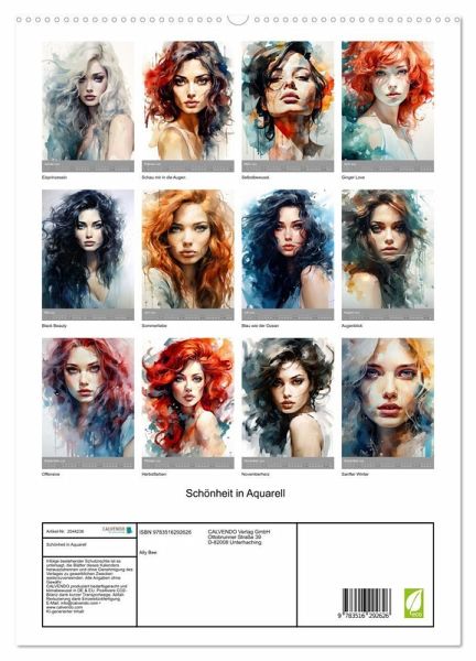 Erleben Sie das Jahr 2024 in seiner vollen Pracht mit diesem wunderschönen Aquarell-Frauenporträt-Kalender! Tauchen Sie ein in die Welt zeitloser Schönheit und Anmut, während Sie Monat für Monat von faszinierenden Darstellungen traumhafter Frauen verzaubert werden.