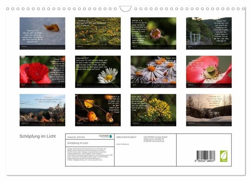 QUALITÄT - Hochwertiger Fotokalender mit 12 wunderschönen Motiven auf lichtbeständigem Bilderdruckpapier, robuste Spiralbindung mit Aufhängebügel.NACHHALTIG - deutliche Abfallreduzierung durch bedarfsgerechte Einzelstückfertigung, umweltfreundliches FSC-zertifiziertes Papier, Produktion in Deutschland, klimabewusste Logistik.PERFEKTES GESCHENK - Kalender für Freunde und Familie, für Kinder und Erwachsene, jung und alt, zu Weihnachten, Geburtstag oder zwischendurch.VIELFALT - Bildkalender in verschiedenen Formaten, z.B. DIN A5, DIN A4, DIN A3 sowie DIN A2. Ob Naturmotiv, Gemälde oder Fotos, ideal für ein persönliches Wohlfühlambiente.Gottes Schöpfung mit Bibelsprüchen von Autor(in): Katrin Schaarschmidt