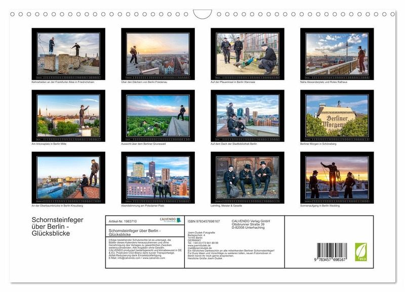 Der beliebte Glücksbringer aus dem Handwerk ist natürlich der Schornsteinfeger. Bei seiner Arbeit in luftiger Höhe über der Stadt erlebt er oft die schönsten Aussichten. Der Fotograf Joern Dudek hat die Kaminfeger aus Berlin bei ihrer täglichen Arbeit begleiten dürfen und dabei die schönsten Momente mit seiner Kamera festgehalten. Aufgrund des großen Erfolges der ersten beiden Berliner Schornsteinfeger Kalender geht es hier nun in eine neue Runde mit stimmungsvollen Motiven!