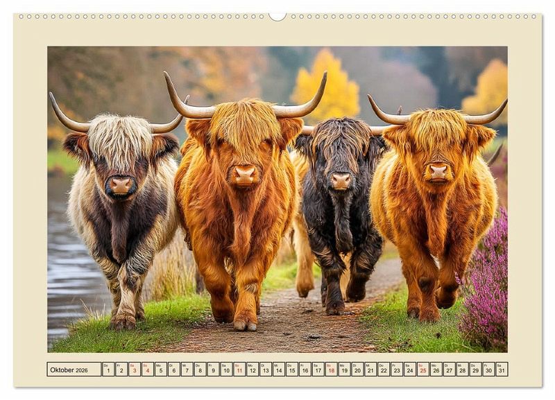 Dieser Kalender zeigt wunderschöne Bilder von schottischen Hochlandrindern in verschiedenen Landschaften und Momenten. Die würdevollen Tiere beeindrucken durch ihre Ruhe, Stärke und ihr ikonisches Aussehen mit zotteligem Fell und imposanten Hörnern. Ob einzeln im Stall, in der Natur oder als neugierige Gruppe, jede Szene erzählt ihre eigene kleine Geschichte. Alle Illustrationen wurden mit der Hilfe von KI erstellt und bringen die wilde Schönheit der Highlands direkt in ihr Zuhause.