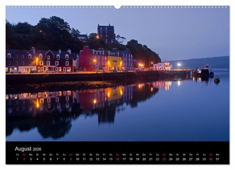Der Kalender zeigt Schottische Landschaften (Küsten, Berge, Wasserfälle) und Architektur (Dörfer, Burgen, Leuchttürme und Brücken).