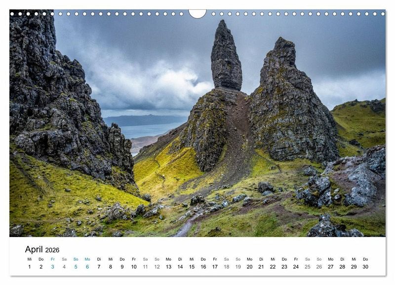 Eileen Donan Castle, Sligachan Old Bridge, Neist Point Lighthouse, The Old Man of Storr, Kilchurn Castle, Dunvegan Castle, Quiraing und Edinburgh. Der Kalendertitel zeigt ein weiteres Bild des Quiraing.