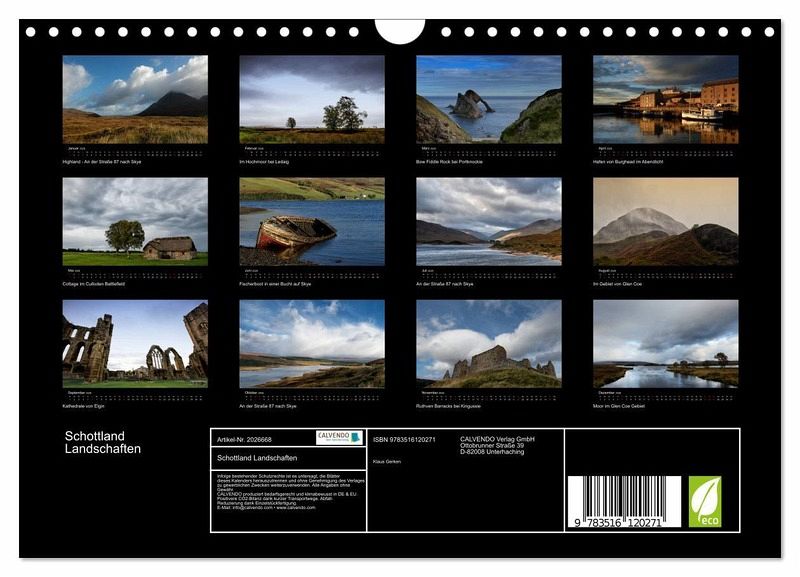 Schottlands ist vielfältig in seiner Landschaft. Einzigartige Moorgebiete, die Highlands ebenso wie die Küstenstreifen und bedeutende Sehenswürdigkeiten machen das Land zu einem traumhaften Erlebnis. In diesem Kalender sind Momente dieser fantastischen Landschaft in reizvollen, einmaligen Lichtsituationen und Perspektiven wiedergegeben.