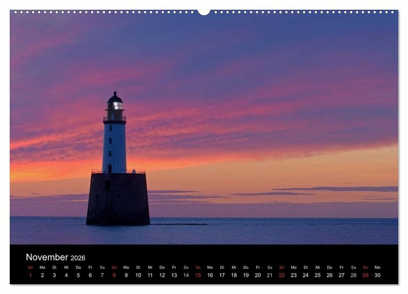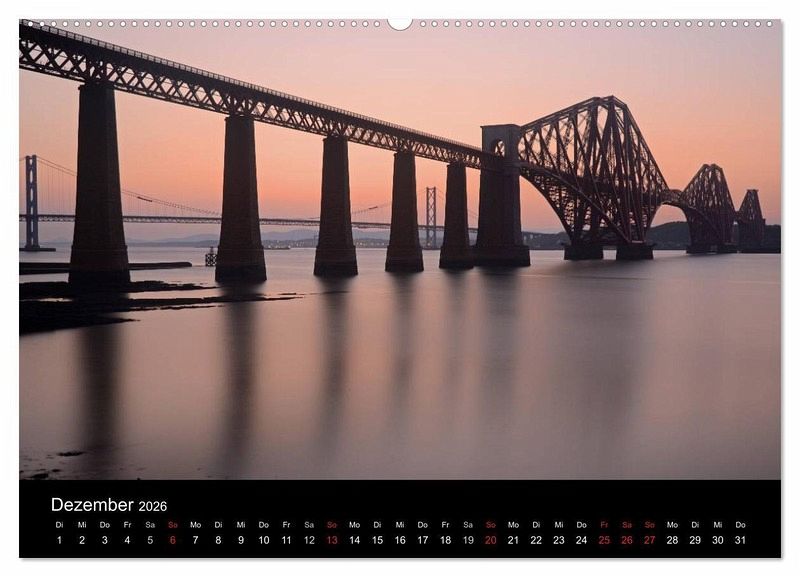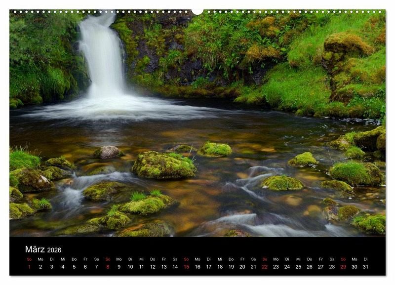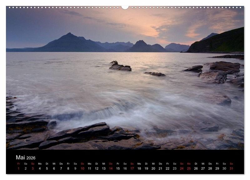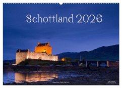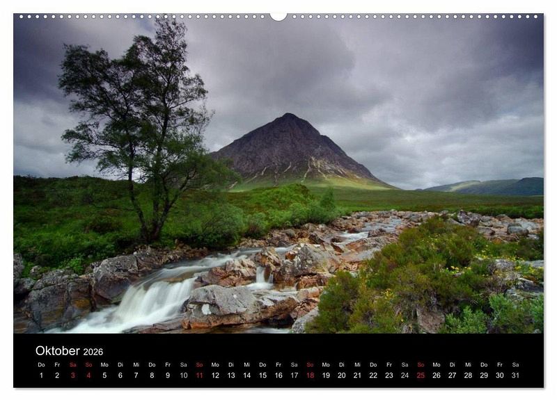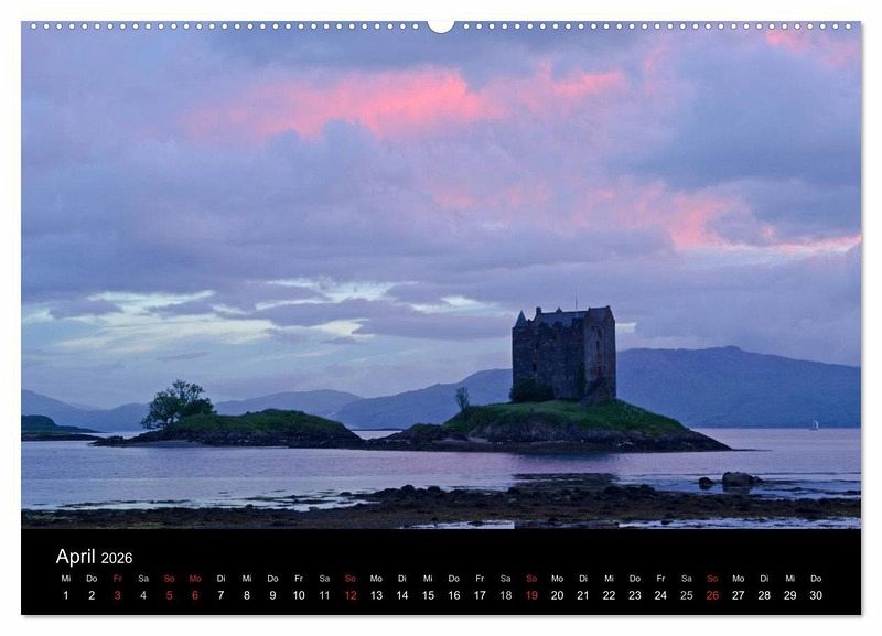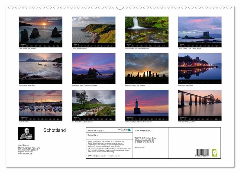 Der Kalender zeigt Schottische Landschaften (Küsten, Berge, Wasserfälle) und Architektur (Dörfer, Burgen, Leuchttürme und Brücken).