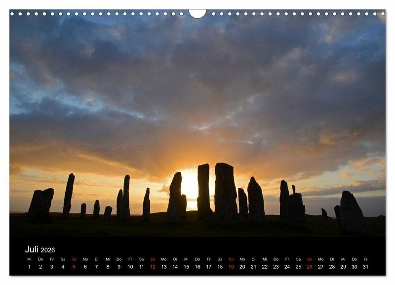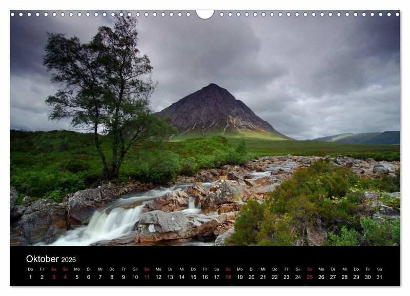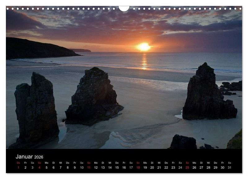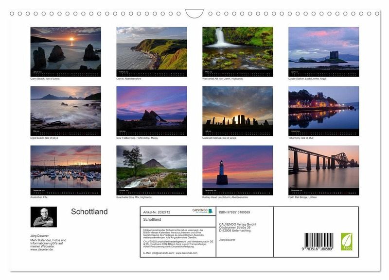 Der Kalender zeigt Schottische Landschaften (Küsten, Berge, Wasserfälle) und Architektur (Dörfer, Burgen, Leuchttürme und Brücken).