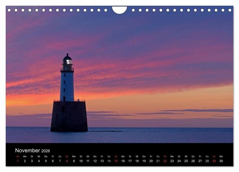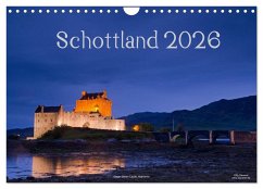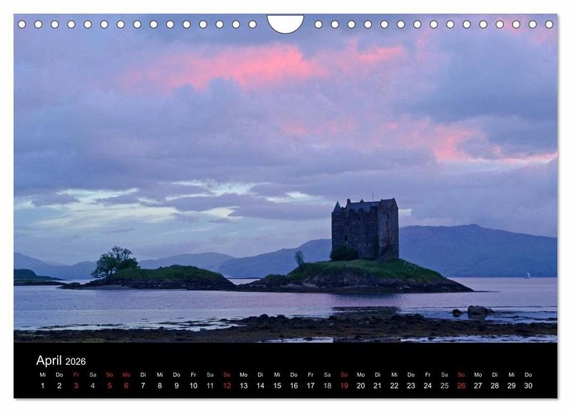 Der Kalender zeigt Schottische Landschaften (Küsten, Berge, Wasserfälle) und Architektur (Dörfer, Burgen, Leuchttürme und Brücken).