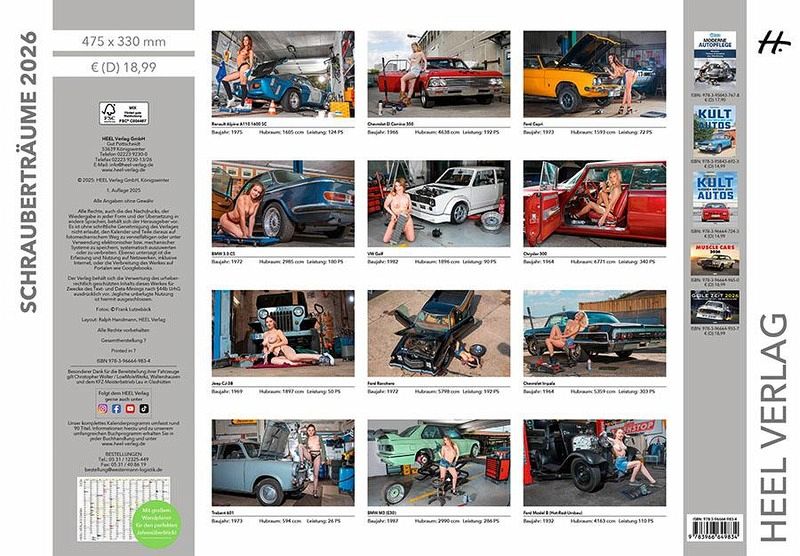 2026 wird ein tolles Jahr für Schrauber, Nachwuchsbauern, Motorrad-Fans und alle anderen Interessierten. Denn Fotograf Frank Lutzebäck hat für den HEEL-Verlag eine Reihe von erotischen Kalendern fotografiert. Alle Kalender zeigen jeweils zwölf attraktive Models, die einmal mit Traumautos posieren, sexy abgelichtet sind vor schönen alten Traktoren oder verführerisch in Szene gesetzt sind mit nostalgischen MZ-, Schwalben- und Mofa-Modellen. Ästhetische Erotik-Fotografie-Kalender 2026 vom Fotograf Frank Lutzebäck im HEEL-Verlag: Jungbauernträume, Schwalbenmädchen, Mofa-Mädels, Schrauberträume. Der großformatige Poster-Kalender von Profifotograf Frank Lutzebäck zeigt zwölf attraktive Models, sexy und verführerisch in Szene gesetzt in stimmungsvoller Location. Schöne Frauen und top restaurierte Oldtimer: Damit ist der Kalender Schrauberträume der ultimative erotische Wandschmuck für die Werkstatt und der perfekte Jahresbegleiter für Hobby-Schrauber, Automobil-Enthusiasten und Oldtimer-Fahrer! Hochwertige Ausstattung: Mit großem Wandplaner für den perfekten Jahresüberblick, 14 Seiten Kunstdruckpapier, Cover mit Glanzlack veredelt, stabile Rückwand, silberne Spiralbindung und klimaneutral in Deutschland produziert.