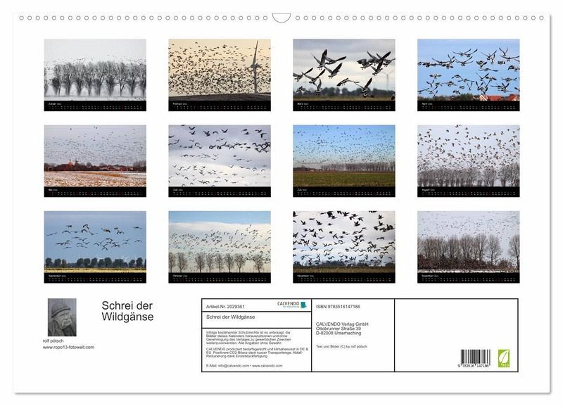 QUALITÄT - Hochwertiger Fotokalender mit 12 wunderschönen Motiven auf lichtbeständigem Bilderdruckpapier, robuste Spiralbindung mit Aufhängebügel.NACHHALTIG - deutliche Abfallreduzierung durch bedarfsgerechte Einzelstückfertigung, umweltfreundliches FSC-zertifiziertes Papier, Produktion in Deutschland, klimabewusste Logistik.PERFEKTES GESCHENK - Kalender für Freunde und Familie, für Kinder und Erwachsene, jung und alt, zu Weihnachten, Geburtstag oder zwischendurch.VIELFALT - Bildkalender in verschiedenen Formaten, z.B. DIN A5, DIN A4, DIN A3 sowie DIN A2. Ob Naturmotiv, Gemälde oder Fotos, ideal für ein persönliches Wohlfühlambiente.In beeindruckenden Fotos zeigt der Fotograf Rolf Pötsch, wie Schwärme von Wildgänsen schreiend über das Land fliegen. von Autor(in): ropo13