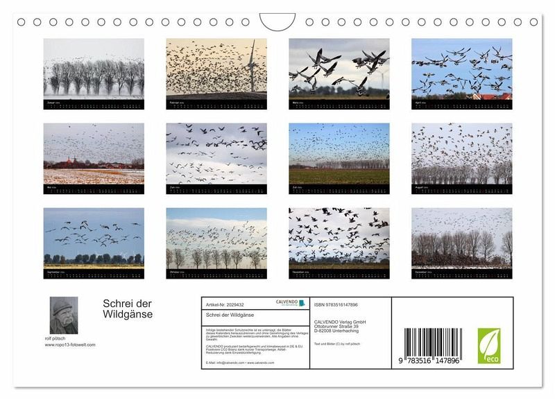 QUALITÄT - Hochwertiger Fotokalender mit 12 wunderschönen Motiven auf lichtbeständigem Bilderdruckpapier, robuste Spiralbindung mit Aufhängebügel.NACHHALTIG - deutliche Abfallreduzierung durch bedarfsgerechte Einzelstückfertigung, umweltfreundliches FSC-zertifiziertes Papier, Produktion in Deutschland, klimabewusste Logistik.PERFEKTES GESCHENK - Kalender für Freunde und Familie, für Kinder und Erwachsene, jung und alt, zu Weihnachten, Geburtstag oder zwischendurch.VIELFALT - Bildkalender in verschiedenen Formaten, z.B. DIN A5, DIN A4, DIN A3 sowie DIN A2. Ob Naturmotiv, Gemälde oder Fotos, ideal für ein persönliches Wohlfühlambiente.In beeindruckenden Fotos zeigt der Fotograf Rolf Pötsch, wie Schwärme von Wildgänsen schreiend über das Land fliegen. von Autor(in): ropo13