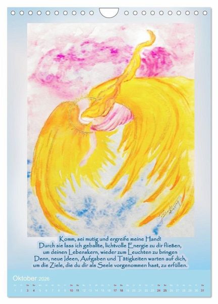 Sanfte Farben, die nicht überfordern, sondern beruhigen und auch kräftige, die erfreuen. Jede Illustration meiner Engel ist handgemalt und einzigartig. Ideal als Begleiter durch das Jahr - zum Träumen, Planen und Entspannen. Einfach ein Wohlgefühl schenken und berühren.