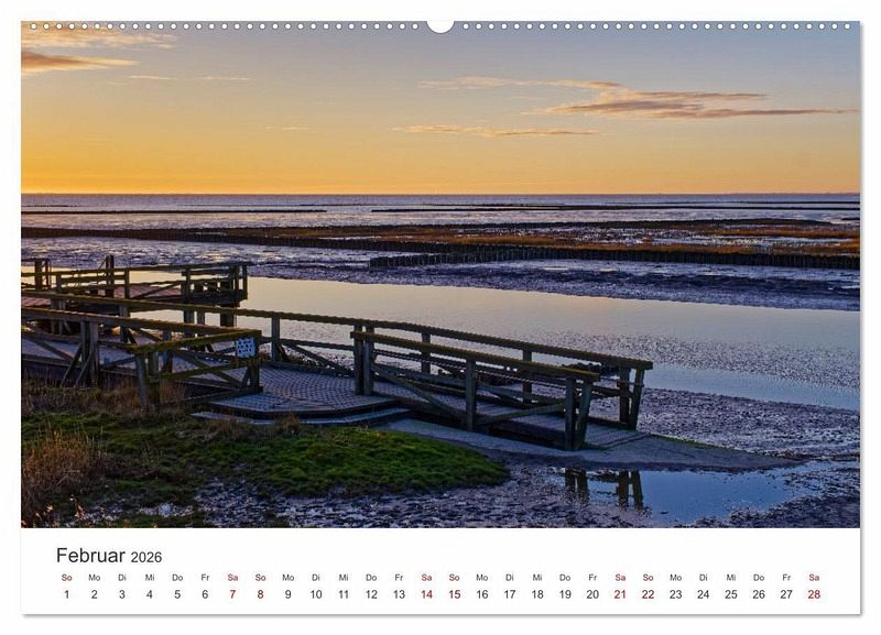 Februar: Trockenen Fusses durchs abendliche Watt ermöglicht ein Steg am Deich vor dem Schöpfwerk Südwesthörn