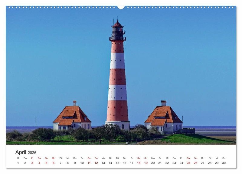April: Der 40 m hohe Leuchtturm Westerheversand ist das Wahrzeichen der Halbinsel Eiderstedt in Schleswig-Holstein