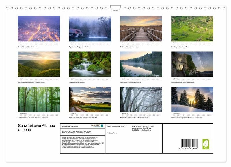 QUALITÄT - Hochwertiger Fotokalender mit 12 wunderschönen Motiven auf lichtbeständigem Bilderdruckpapier, robuste Spiralbindung mit Aufhängebügel.NACHHALTIG - deutliche Abfallreduzierung durch bedarfsgerechte Einzelstückfertigung, umweltfreundliches FSC-zertifiziertes Papier, Produktion in Deutschland, klimabewusste Logistik.PERFEKTES GESCHENK - Kalender für Freunde und Familie, für Kinder und Erwachsene, jung und alt, zu Weihnachten, Geburtstag oder zwischendurch.VIELFALT - Bildkalender in verschiedenen Formaten, z.B. DIN A5, DIN A4, DIN A3 sowie DIN A2. Ob Naturmotiv, Gemälde oder Fotos, ideal für ein persönliches Wohlfühlambiente.Eine Reise durch die Schwäbische Alb von Autor(in): Andreas Frank