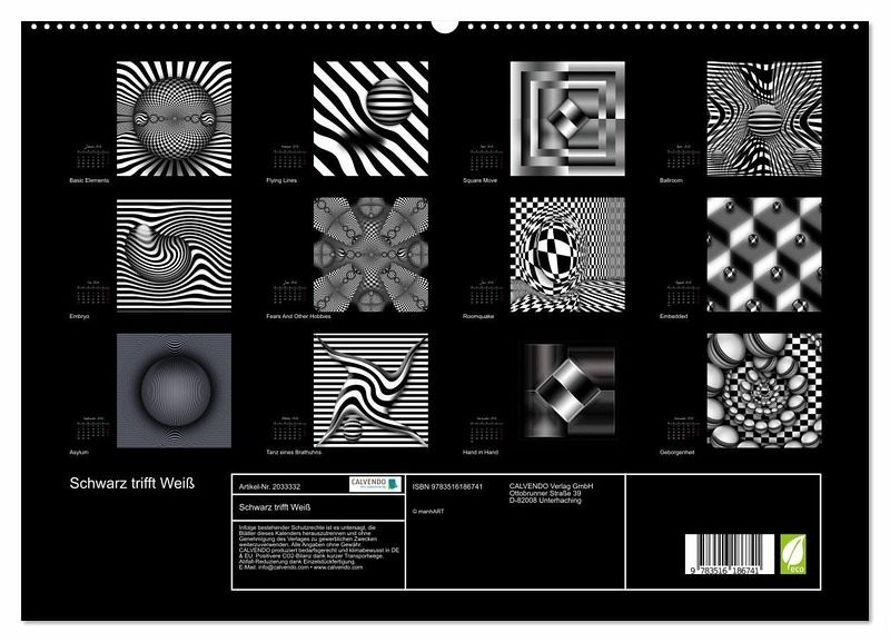 PREMIUM-LINIE - Brillanter Fotokalender mit 12 wunderschönen Motiven, Kunstdruck in Hochglanz in Museumsqualität.QUALITÄT - edle Materialien, stabile Rückwand mit 2 innovativen Einstecktaschen für eine optimale Präsentation an der Wand.NACHHALTIG - deutliche Abfallreduzierung durch bedarfsgerechte Einzelstückfertigung, umweltfreundliches FSC-zertifiziertes Papier, Produktion in Deutschland, klimabewusste Logistik.PERFEKTES GESCHENK - Kalender für Freunde und Familie, für Kinder und Erwachsene, jung und alt, zu Weihnachten, Geburtstag oder zwischendurch.Optische Kunst in schwarz-weiß von Autor(in): Werner Manhart