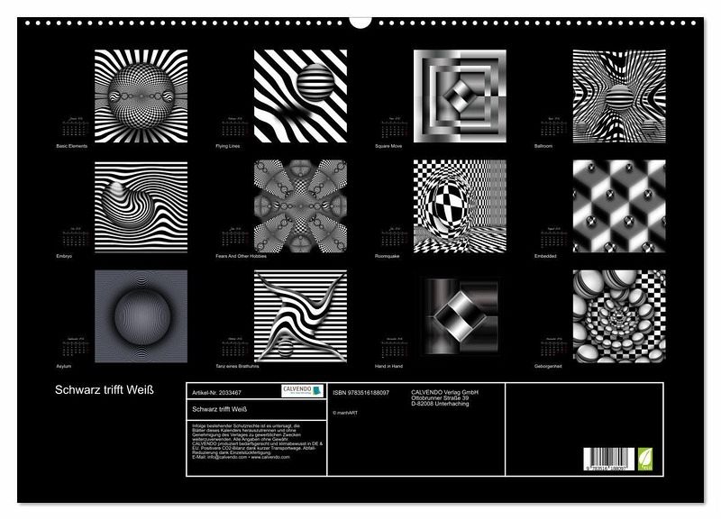 QUALITÄT - Hochwertiger Fotokalender mit 12 wunderschönen Motiven auf lichtbeständigem Bilderdruckpapier, robuste Spiralbindung mit Aufhängebügel.NACHHALTIG - deutliche Abfallreduzierung durch bedarfsgerechte Einzelstückfertigung, umweltfreundliches FSC-zertifiziertes Papier, Produktion in Deutschland, klimabewusste Logistik.PERFEKTES GESCHENK - Kalender für Freunde und Familie, für Kinder und Erwachsene, jung und alt, zu Weihnachten, Geburtstag oder zwischendurch.VIELFALT - Bildkalender in verschiedenen Formaten, z.B. DIN A5, DIN A4, DIN A3 sowie DIN A2. Ob Naturmotiv, Gemälde oder Fotos, ideal für ein persönliches Wohlfühlambiente.Optische Kunst in schwarz-weiß von Autor(in): Werner Manhart