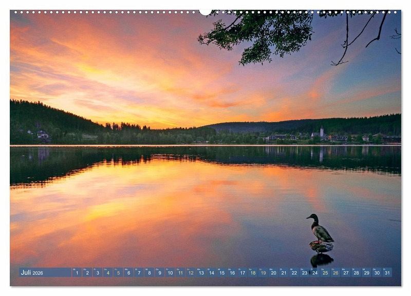 Juli: Der Titisee bei Sonnenuntergang, gespeist wird er von dem das Bärental durchfließenden Seebach, im Hintergrund der Kurort Titisee-Neustadt