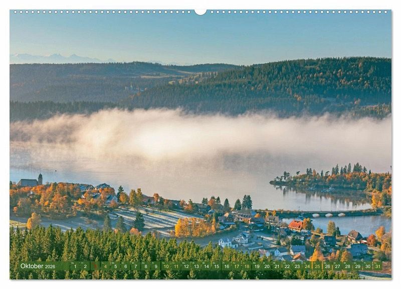 Oktober: Der Schluchsee und Nebel über dem Wasser, ursprünglich ein Gletschersee vom Feldberg, heute ein Stausee, Schwarzwald
