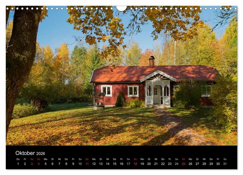 Oktober: Schwedenhaus umgeben vom Herbstwald bei Tibro