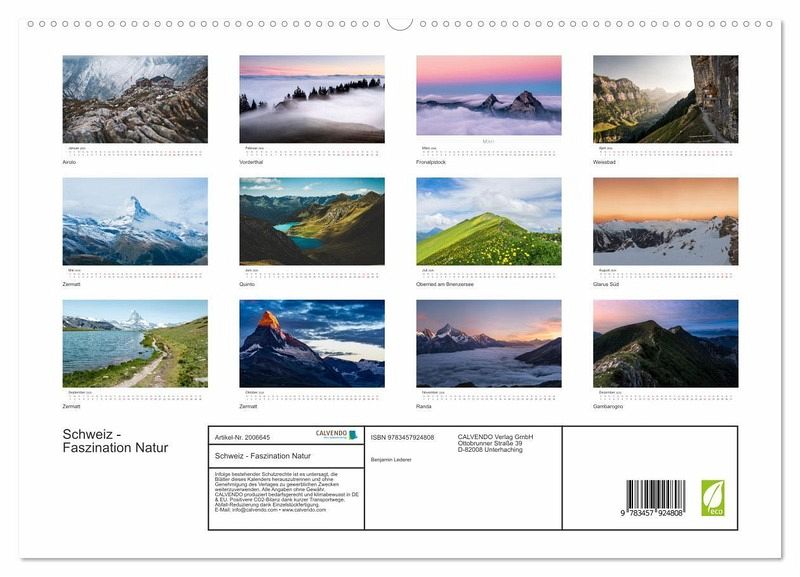 QUALITÄT - Hochwertiger Fotokalender mit 12 wunderschönen Motiven auf lichtbeständigem Bilderdruckpapier, robuste Spiralbindung mit Aufhängebügel.NACHHALTIG - deutliche Abfallreduzierung durch bedarfsgerechte Einzelstückfertigung, umweltfreundliches FSC-zertifiziertes Papier, Produktion in Deutschland, klimabewusste Logistik.PERFEKTES GESCHENK - Kalender für Freunde und Familie, für Kinder und Erwachsene, jung und alt, zu Weihnachten, Geburtstag oder zwischendurch.VIELFALT - Bildkalender in verschiedenen Formaten, z.B. DIN A5, DIN A4, DIN A3 sowie DIN A2. Ob Naturmotiv, Gemälde oder Fotos, ideal für ein persönliches Wohlfühlambiente.Einzigartige Aufnahmen der Schweiz. von Autor(in): Benjamin Lederer