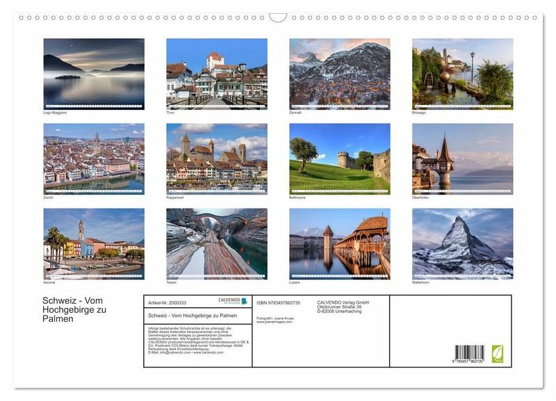 QUALITÄT - Hochwertiger Fotokalender mit 12 wunderschönen Motiven auf lichtbeständigem Bilderdruckpapier, robuste Spiralbindung mit Aufhängebügel.NACHHALTIG - deutliche Abfallreduzierung durch bedarfsgerechte Einzelstückfertigung, umweltfreundliches FSC-zertifiziertes Papier, Produktion in Deutschland, klimabewusste Logistik.PERFEKTES GESCHENK - Kalender für Freunde und Familie, für Kinder und Erwachsene, jung und alt, zu Weihnachten, Geburtstag oder zwischendurch.VIELFALT - Bildkalender in verschiedenen Formaten, z.B. DIN A5, DIN A4, DIN A3 sowie DIN A2. Ob Naturmotiv, Gemälde oder Fotos, ideal für ein persönliches Wohlfühlambiente.Eine Fotorundreise durch die Schweiz, die vom Hochgebirge zu mediterranem Südflair viel zu bieten hat. von Autor(in): Joana Kruse