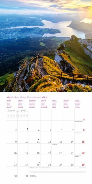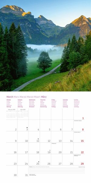 Der Schweiz Broschürenkalender 2026 aus der Reihe 1000 Places to See Before You Die entführt Sie Monat für Monat in die atemberaubende Vielfalt der Schweiz - von imposanten Berggipfeln und glasklaren Seen bis zu idyllischen Tälern und charmanten Städten. Jede Seite kombiniert beeindruckende Panoramaaufnahmen mit einem integrierten Notizkalendarium. Im kompakten Format von 30 × 30 cm ist der Kalender ein stilvoller Wandbegleiter, der zugleich praktisch nutzbar ist.Highlights:Faszinierende Panorama-Motive: Monatlich kunstvolle Bilder aus Natur & Städten der SchweizFormat 30 × 30 cm: Quadratisch, dekorativ und platzsparendNotizkalendarium integriert: Genügend Raum für Termine, Gedanken & PlanungenFeiertage & Ferien D/A/CH: Für Ihre Reise- und Urlaubsplanung in einem BlickJahresübersichten & Extras: Nützliche Ergänzungen zur OrientierungDer 1000 Places - Schweiz Broschürenkalender 2026 vereint visuelle Faszination, praktischen Nutzen und stilvolle Gestaltung. Ein perfekter Kalender für Liebhaber der Schweizer Landschaft, Entdecker und alle, die Kunst und Alltag vereinen möchten.Der Schweiz Broschürenkalender 2026 aus der Reihe 1000 Places to See Before You Die entführt Sie Monat für Monat in die atemberaubende Vielfalt der Schweiz - von imposanten Berggipfeln und glasklaren Seen bis zu idyllischen Tälern und charmanten Städten. Jede Seite kombiniert beeindruckende Panoramaaufnahmen mit einem integrierten Notizkalendarium. Im kompakten Format von 30 × 30 cm ist der Kalender ein stilvoller Wandbegleiter, der zugleich praktisch nutzbar ist.Highlights:Faszinierende Panorama-Motive: Monatlich kunstvolle Bilder aus Natur & Städten der SchweizFormat 30 × 30 cm: Quadratisch, dekorativ und platzsparendNotizkalendarium integriert: Genügend Raum für Termine, Gedanken & PlanungenFeiertage & Ferien D/A/CH: Für Ihre Reise- und Urlaubsplanung in einem BlickJahresübersichten & Extras: Nützliche Ergänzungen zur OrientierungDer 1000 Places - Schweiz Broschürenkalender 2026 vereint visuelle Faszination, praktischen Nutzen und stilvolle Gestaltung. Ein perfekter Kalender für Liebhaber der Schweizer Landschaft, Entdecker und alle, die Kunst und Alltag vereinen möchten.