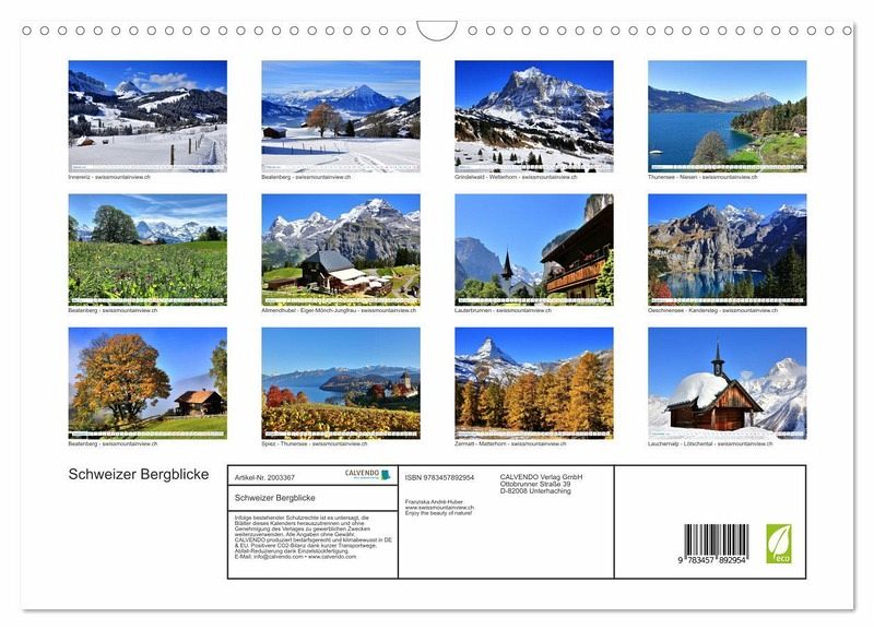 QUALITÄT - Hochwertiger Fotokalender mit 12 wunderschönen Motiven auf lichtbeständigem Bilderdruckpapier, robuste Spiralbindung mit Aufhängebügel.NACHHALTIG - deutliche Abfallreduzierung durch bedarfsgerechte Einzelstückfertigung, umweltfreundliches FSC-zertifiziertesPapier, Produktion in Deutschland, klimabewusste Logistik.PERFEKTES GESCHENK - Kalender für Freunde und Familie, für Kinder und Erwachsene, jung und alt, zu Weihnachten, Geburtstag oder zwischendurch.VIELFALT - Bildkalender in verschiedenen Formaten, z.B. DIN A5, DIN A4, DIN A3 sowie DIN A2. Ob Naturmotiv, Gemälde oder Fotos, ideal für ein persönliches Wohlfühlambiente.Schweizer Bergblicke zu jeder Jahreszeit von Autor(in): swissmountainview.ch