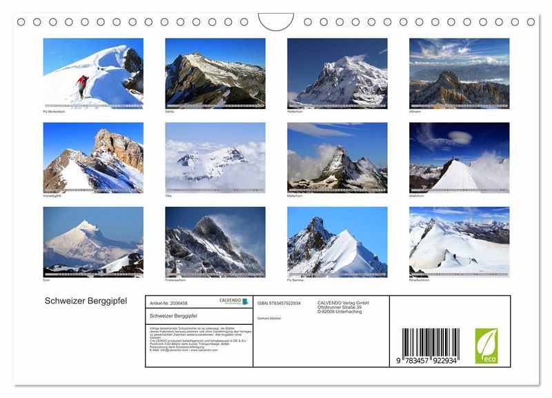 QUALITÄT - Hochwertiger Fotokalender mit 12 wunderschönen Motiven auf lichtbeständigem Bilderdruckpapier, robuste Spiralbindung mit Aufhängebügel.NACHHALTIG - deutliche Abfallreduzierung durch bedarfsgerechte Einzelstückfertigung, umweltfreundliches FSC-zertifiziertes Papier, Produktion in Deutschland, klimabewusste Logistik.PERFEKTES GESCHENK - Kalender für Freunde und Familie, für Kinder und Erwachsene, jung und alt, zu Weihnachten, Geburtstag oder zwischendurch.VIELFALT - Bildkalender in verschiedenen Formaten, z.B. DIN A5, DIN A4, DIN A3 sowie DIN A2. Ob Naturmotiv, Gemälde oder Fotos, ideal für ein persönliches Wohlfühlambiente.Einige der schönsten Schweizer Berggipfel, stehen im Berner Oberland, im Wallis und im Apenzellerland. von Autor(in): Gerhard Albicker