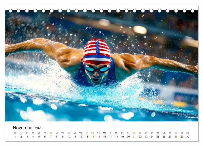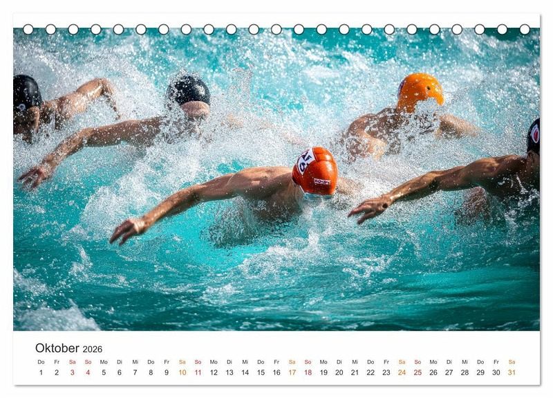 Schwimmen ist eine beliebte Freizeitaktivität und Sportart. Als Sport ist Schwimmen ein Spiel mit dem Wasser, ein Kampf gegen die Zeit. Es bedeutet, den eigenen Körper durch das Element zu treiben und seine eignenen Grenzen zu verschieben. Dieser Kalender fängt die Faszination in eindrucksvollen KI-Bildern ein. Man spürt förmlich die Anstrengung und Leichtigkeit, das Tempo und die Technik - auch bei packenden Wettkämpfen. Über und unter Wasser zeigen die Aufnahmen den Moment der totalen Fokussierung, das Spritzen der Tropfen, die Dynamik jedes einzelnen Zugs. Ein Muss für alle, die den Schwimmsport lieben - und für jene, die ihn neu entdecken wollen.