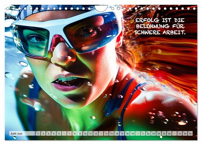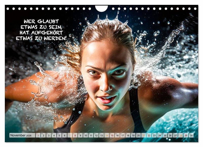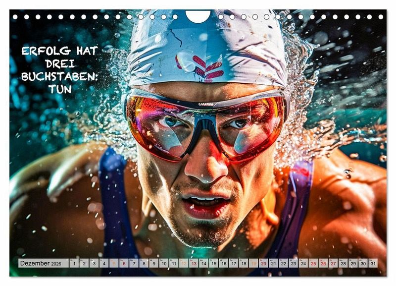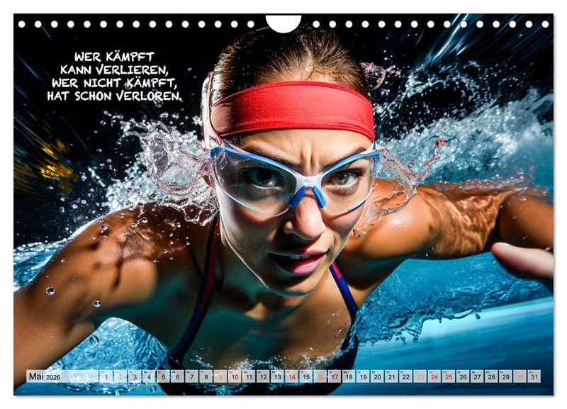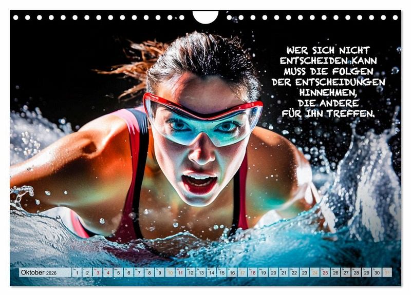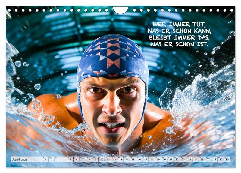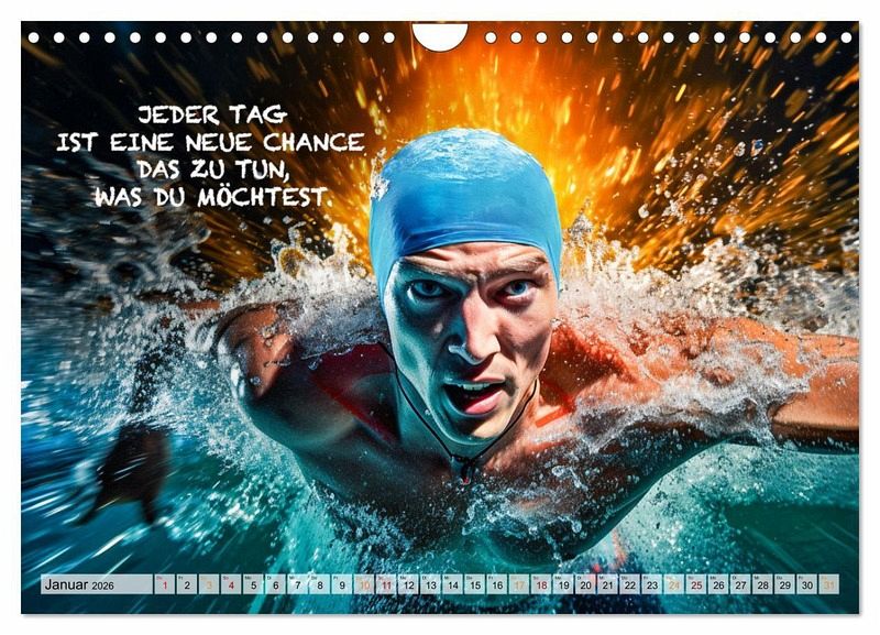 Willkommen zu unserem inspirierenden Wandkalender, der Sie durch das kommende Jahr begleiten wird. Tauchen Sie ein in die Welt des Schwimmens und lassen Sie sich von der Kraft der Motivation mitreißen. Dieser Kalender ist eine Hommage an die unvergleichliche Kombination aus sportlicher Leidenschaft und innerer Stärke.