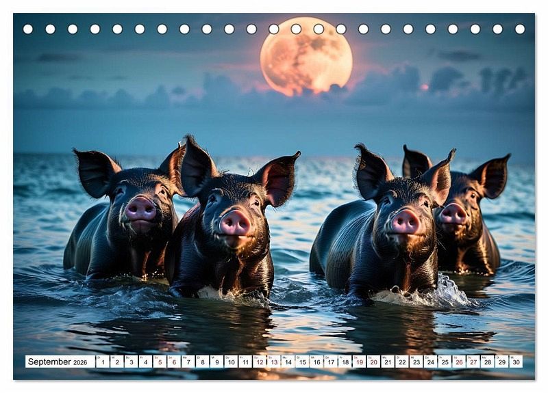 Juni: Fröhliche Schweine plantschen verspielt im Meerwasser