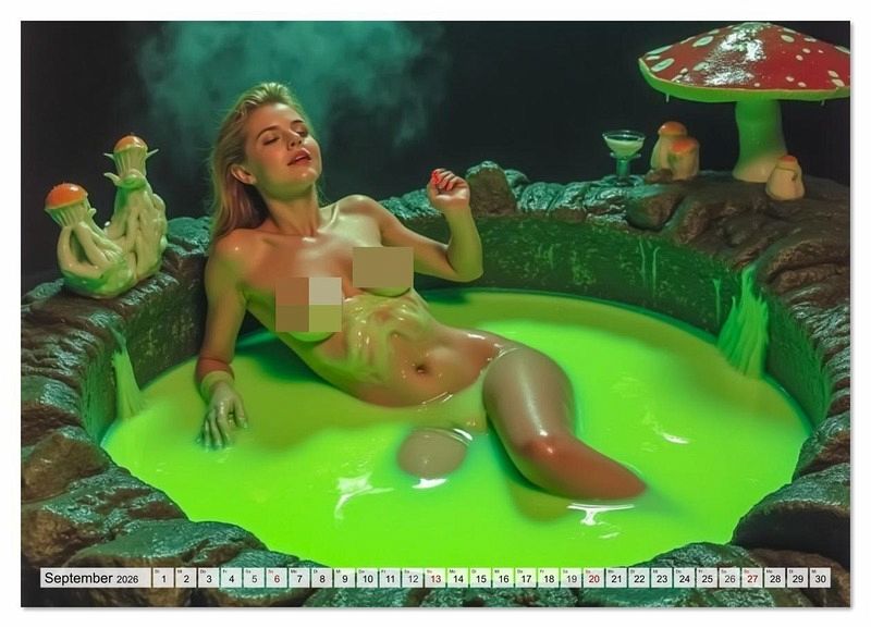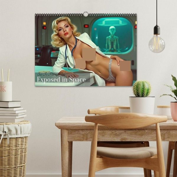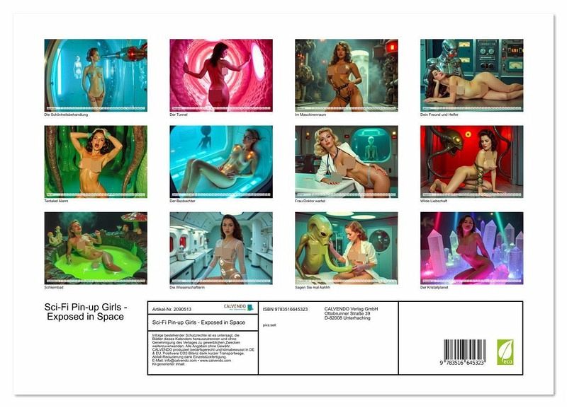Ein stilvoller Retro-Sci-Fi-KI Kalender im Look der 1950er, der sinnliche Pin-up-Ästhetik mit außerirdischen Begegnungen vereint - mit verführerischen Raumfrauen, Tentakelwesen und einer ordentlichen Portion galaktischer Erotik.