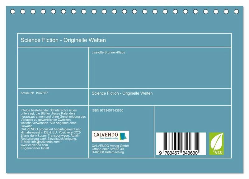 QUALITÄT - Hochwertiger Fotokalender mit 12 wunderschönen Motiven auf lichtbeständigem Bilderdruckpapier, robuste Spiralbindung.NACHHALTIG - deutliche Abfallreduzierung durch bedarfsgerechte Einzelstückfertigung, umweltfreundliches FSC-zertifiziertes Papier, Produktion in Deutschland, klimabewusste Logistik.PERFEKTES GESCHENK - Kalender für Freunde und Familie, für Kinder und Erwachsene, jung und alt, zu Weihnachten, Geburtstag oder zwischendurch.VIELFALT - Bildkalender in verschiedenen Formaten, z.B. DIN A5, DIN A4, DIN A3 sowie DIN A2. Ob Naturmotiv, Gemälde oder Fotos, ideal für ein persönliches Wohlfühlambiente.Zukunftsvisionen im Science Fiction Stil von Autor(in): Liselotte Brunner-Klaus