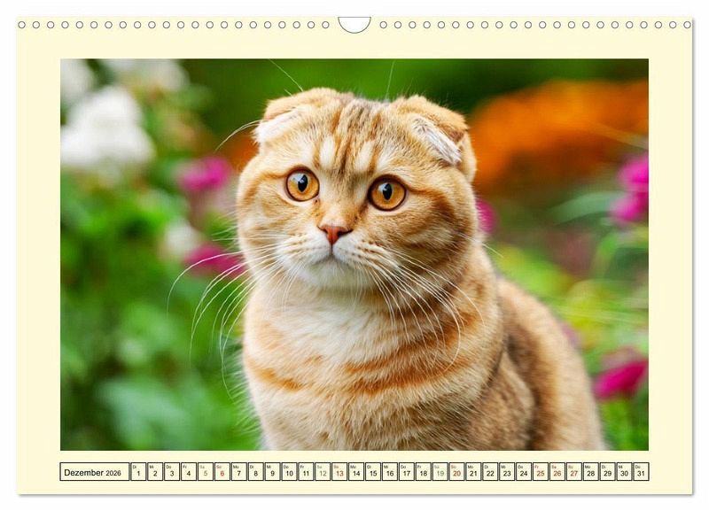 Dieser besondere Kalender zeigt die einzigartige Ausstrahlung der Scottish Fold Katzen - mit ihren markanten gefalteten Ohren, dem runden Gesicht und dem sanftmütigen Wesen. Die Katzen wirken dabei gleichzeitig neugierig, ruhig und voller Charakter - so wie man die Scottish Fold liebt. Alle Bilder wurden mit Hilfe von KI erstellt und präsentieren die Tiere in idyllischen Gartenszenen. Jede Monatsseite ist ein kleines Porträt ihrer ganz eigenen Eleganz und natürlichen Verspieltheit.