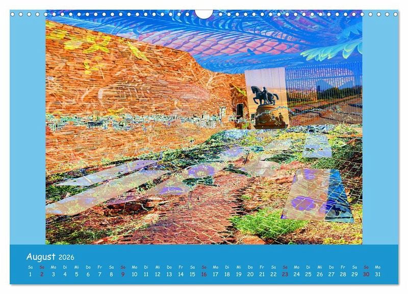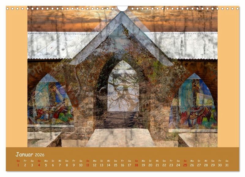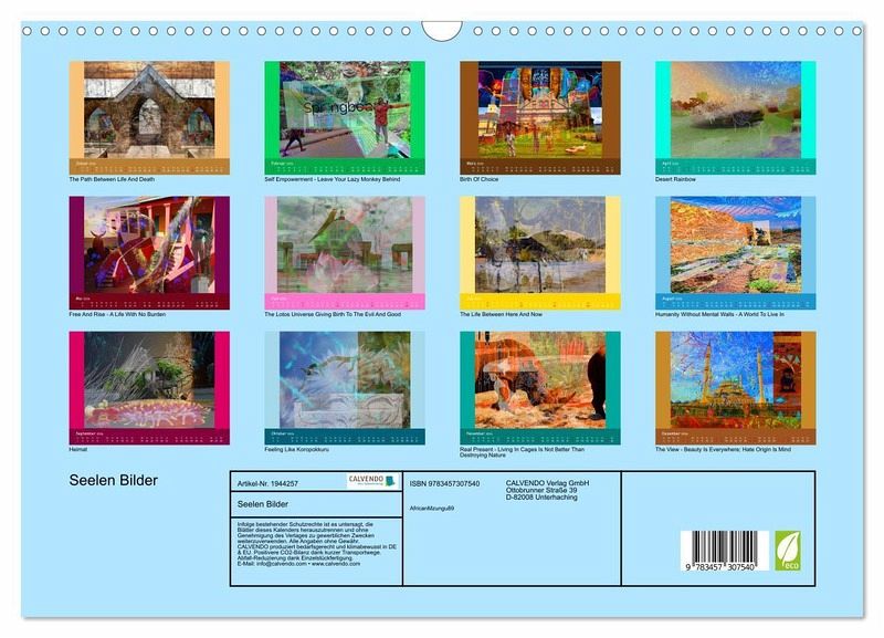 Lassen Sie sich von atemberaubenden Fotocollagen und innovativen digitalen Überlappungen verzaubern. Jeder Monat bietet Ihnen eine einzigartige Fusion aus Farben, Formen und Momenten. Dargestellt in einzigartigen Collagen. Als Ausgangspunkt dienen die eigenen Afrikabilder. Jede Monatscollage kombiniert Fotografien, Texturen und verschiedene Materialien, die die Vielfalt und Schönheit Afrikas widerspiegeln. Die sorgfältig gestalteten Kunstwerke bringen Ihnen nicht nur die Schönheit, sondern auch die Magie der digitalen Kunst näher. Einzigartige Kunst, faszinierende Collagen, perfekt für Kunstliebhaber. Lassen Sie sich Monat für Monat inspirieren. Erleben Sie das Jahr auf eine völlig neue Weise mit dem Kalender Seelen Bilder, der mehr ist als nur ein Zeitmesser!
