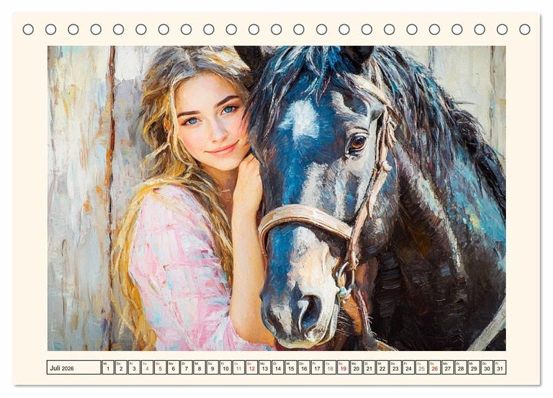 Dieser Kalender vereint die Kunst der KI mit der traditionellen Schönheit des Ölgemäldes. Jedes Bild zeigt eine Frau und ihr Pferd in Momenten tiefster Verbundenheit, eingefangen in warmen, lebendigen Farben. Die Bilder vermitteln das Gefühl von Vertrauen, Harmonie und stiller Kommunikation zwischen Mensch und Tier. Lassen Sie sich von der Intensität und Zärtlichkeit dieser einzigartigen Partnerschaft durch das Jahr begleiten.