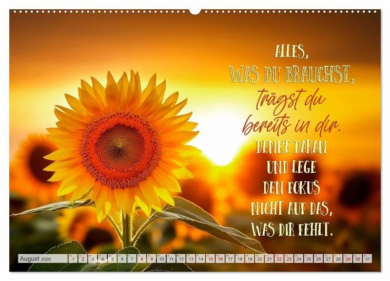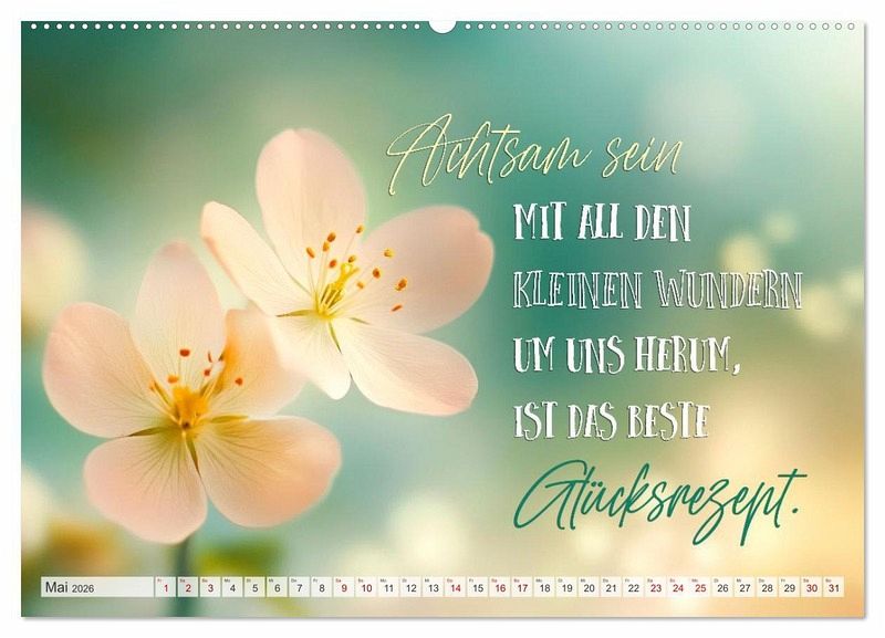 Dieser liebevoll gestaltete Kalender begleitet dich Monat für Monat mit inspirierenden Sprüchen, die helfen, innezuhalten, durchzuatmen und neue Kraft zu schöpfen. Jeder Monat schenkt dir eine Portion Gelassenheit und Leichtigkeit. Ob auf dem Schreibtisch, in der Küche oder als Geschenk; dieser Kalender ist ein täglicher Reminder daran, daß das Gute oft ganz nah ist und manchmal nur ein bewußter Moment entfernt. Mit Lebenserfahrung, Herz und KI erstellt.