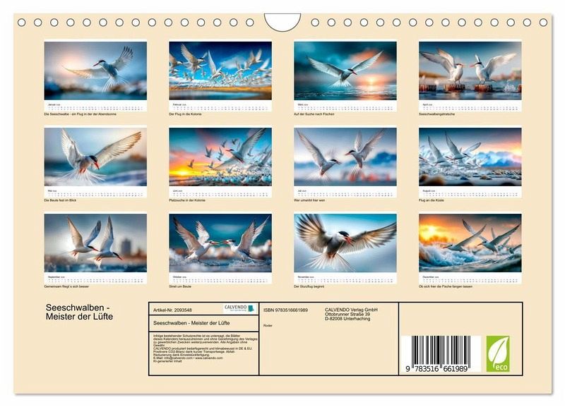 Bewundern Sie die faszinierende Lebensweise der Seeschwalben - jener grazilen Flugkünstler, die mit scheinbar müheloser Leichtigkeit über das Wasser gleiten, in großen Schwärmen starten und landen und mit scharfem Blick nach Beute Ausschau halten. Dieser Kalender zeigt in eindrucksvollen Bildern die Schönheit und Dynamik dieser Vögel: herrliche Einzelporträts im Flug, natürliche Szenen aus ihrem täglichen Leben und berührende Momente, in denen sich Möwenpaare in der Luft umgarnen und aufeinander aufmerksam machen. Gestaltet mit dem Auge fürs Detail sind diese Bilder ein wunderbares Beispiel für die faszinierende Vogelwelt, wobei die grafische Umsetzung im Zusammenspiel klassischer Gestaltung und ausgewählter KI-basierter Methoden erfolgte. Ideal für alle Vogelliebhaber und Naturfreunde.