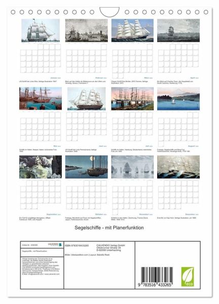 Sehnsüchtig am Ufer stehen und den vorbei gleitenden Segelschiffen nachschauen... Der Wunsch, an Bord zu springen und einfach mit zu segeln... Segelschiffe wecken das Fernweh in uns, die Phantasien von fernen Ländern und von Abenteuern in exotischen Häfen. Segelschiffe waren aber auch seit dem Altertum bis zum 19. Jahrhundert eines der wichtigsten Verkehrsmittel für den Transport von Gütern und Personen über längere Distanzen. Kommen Sie mit auf die Reise. Der Kalender präsentiert 12 historische Illustrationen von Segelschiffen in unterschiedlichen Ländern mit Hintergundinformationen zu den Abbildungen. Mit Planerfunktion! Planen Sie Ihre Termine und Veranstaltungen ein ganzes Jahr mit 5 Spalten im nautischen Flair und machen Sie sich bereit zum Ablegen. Eine besondere Geschenkidee für Segler, Freunde alter Segelschiffe, Wasserratten und Kunstliebhaber. Oder schenken Sie ihn sich doch einfach selbst!