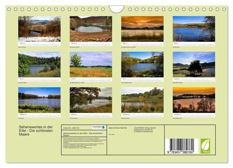 QUALITÄT - Hochwertiger Fotokalender mit 12 wunderschönen Motiven auf lichtbeständigem Bilderdruckpapier, robuste Spiralbindung mit Aufhängebügel.NACHHALTIG - deutliche Abfallreduzierung durch bedarfsgerechte Einzelstückfertigung, umweltfreundliches FSC-zertifiziertes Papier, Produktion in Deutschland, klimabewusste Logistik.PERFEKTES GESCHENK - Kalender für Freunde und Familie, für Kinder und Erwachsene, jung und alt, zu Weihnachten, Geburtstag oder zwischendurch.VIELFALT - Bildkalender in verschiedenen Formaten, z.B. DIN A5, DIN A4, DIN A3 sowie DIN A2. Ob Naturmotiv, Gemälde oder Fotos, ideal für ein persönliches Wohlfühlambiente.In der Eifel an den schönsten Maaren von Autor(in): Arno Klatt