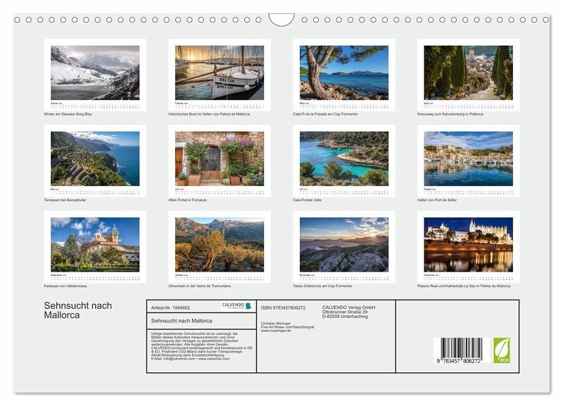 Der Kalender "Sehnsucht nach Mallorca" präsentiert Ihnen mit den faszinierenden Fotos des Reise- und Naturfotografen Christian Müringer die Schönheit und den besonderen Charme der spanischen Balearen-Insel. Entdecken Sie Mallorca aus neuen Blickwinkeln.