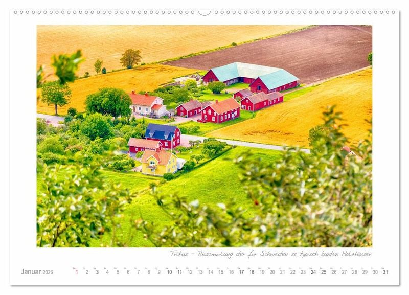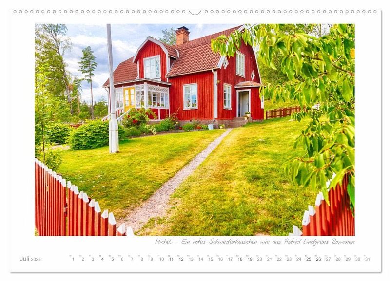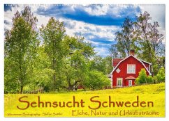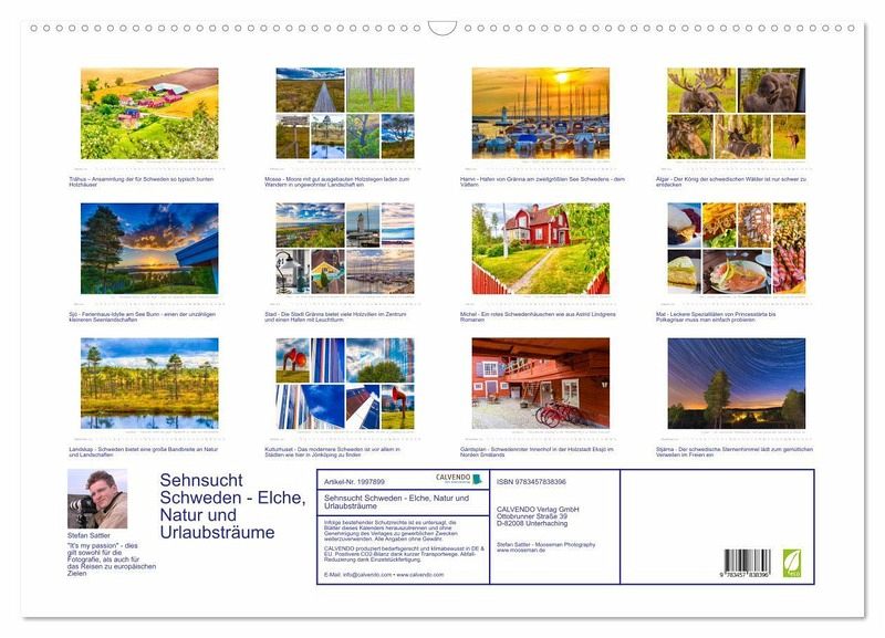 Schwedens große Seen - der Süden Schwedens bietet auch im Landesinneren mit den beiden Seen Vänern und Vättern sowie den unzähligen kleineren Wasserflächen ein spannendes Reiseziel. Die Gemütlichkeit, in einem der kleinen rot-weißen Holzhäuser seinen Urlaub zu verbringen und am Abend in den Sternenhimmel zu blicken, lässt Stress und Hektik vergessen. Ein paar Kilo mehr auf den Rippen mögen es nach den typisch schwedischen Süßigkeiten und Backwaren schon werden, die trotzdem zusammen mit einigen Smørgåsbord, Fisch, Hotdogs und Köttbullar ganz ohne Reue genossen werden sollten. Für den Natur-, Wander- oder Angelfreund gibt es unzählige Möglichkeiten. Die Landschaften sind abwechslungsreich und oft - wie bei den auf Holzstegen begehbaren Moorgebieten - ungewohntes Neuland. Will man die hier zahlenmäßig an sich häufigen Elche - die Könige der Wälder - außer in den zahlreichen Elchparks - auch in freier Natur entdecken bedarf es schon etwas Geduld und scharfer Augen. Es gibt viel zu entdecken: Die Stadt Gränna zum Beispiel - die "Zentrale" der berühmten rot-weißen Zuckerstangen, Polkagrisar genannt, bietet neben den Süßwarenmanufakturen auch einen schönen Hafen mit Leuchtturm. Astrid Lindgrens Welt - nicht nur etwas für Kinder - sondern alle, die ihre Bücher lieben lernten. Auch Michel von Lönnebergas Heimathof Katthult kann man besuchen und sich wundern, dass der freche Junge im schwedischen Original Emil hieß. Die Reihe ließe sich fortsetzen - leider nur ein kleiner Teil der Vielfalt des beliebten Ferienlandes konnte seinen Weg in diesen Kalender finden, der dennoch Lust auf die Rückkehr nach Schweden macht.