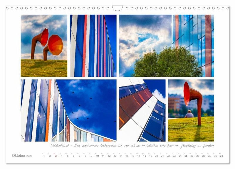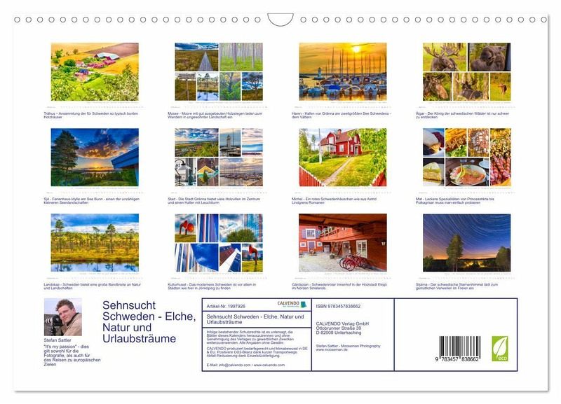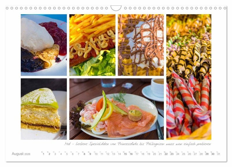 Schwedens große Seen - der Süden Schwedens bietet auch im Landesinneren mit den beiden Seen Vänern und Vättern sowie den unzähligen kleineren Wasserflächen ein spannendes Reiseziel. Die Gemütlichkeit, in einem der kleinen rot-weißen Holzhäuser seinen Urlaub zu verbringen und am Abend in den Sternenhimmel zu blicken, lässt Stress und Hektik vergessen. Ein paar Kilo mehr auf den Rippen mögen es nach den typisch schwedischen Süßigkeiten und Backwaren schon werden, die trotzdem zusammen mit einigen Smørgåsbord, Fisch, Hotdogs und Köttbullar ganz ohne Reue genossen werden sollten. Für den Natur-, Wander- oder Angelfreund gibt es unzählige Möglichkeiten. Die Landschaften sind abwechslungsreich und oft - wie bei den auf Holzstegen begehbaren Moorgebieten - ungewohntes Neuland. Will man die hier zahlenmäßig an sich häufigen Elche - die Könige der Wälder - außer in den zahlreichen Elchparks - auch in freier Natur entdecken bedarf es schon etwas Geduld und scharfer Augen. Es gibt viel zu entdecken: Die Stadt Gränna zum Beispiel - die "Zentrale" der berühmten rot-weißen Zuckerstangen, Polkagrisar genannt, bietet neben den Süßwarenmanufakturen auch einen schönen Hafen mit Leuchtturm. Astrid Lindgrens Welt - nicht nur etwas für Kinder - sondern alle, die ihre Bücher lieben lernten. Auch Michel von Lönnebergas Heimathof Katthult kann man besuchen und sich wundern, dass der freche Junge im schwedischen Original Emil hieß. Die Reihe ließe sich fortsetzen - leider nur ein kleiner Teil der Vielfalt des beliebten Ferienlandes konnte seinen Weg in diesen Kalender finden, der dennoch Lust auf die Rückkehr nach Schweden macht.
