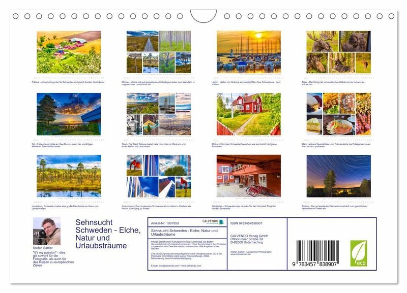 Schwedens große Seen - der Süden Schwedens bietet auch im Landesinneren mit den beiden Seen Vänern und Vättern sowie den unzähligen kleineren Wasserflächen ein spannendes Reiseziel. Die Gemütlichkeit, in einem der kleinen rot-weißen Holzhäuser seinen Urlaub zu verbringen und am Abend in den Sternenhimmel zu blicken, lässt Stress und Hektik vergessen. Ein paar Kilo mehr auf den Rippen mögen es nach den typisch schwedischen Süßigkeiten und Backwaren schon werden, die trotzdem zusammen mit einigen Smørgåsbord, Fisch, Hotdogs und Köttbullar ganz ohne Reue genossen werden sollten. Für den Natur-, Wander- oder Angelfreund gibt es unzählige Möglichkeiten. Die Landschaften sind abwechslungsreich und oft - wie bei den auf Holzstegen begehbaren Moorgebieten - ungewohntes Neuland. Will man die hier zahlenmäßig an sich häufigen Elche - die Könige der Wälder - außer in den zahlreichen Elchparks - auch in freier Natur entdecken bedarf es schon etwas Geduld und scharfer Augen. Es gibt viel zu entdecken: Die Stadt Gränna zum Beispiel - die "Zentrale" der berühmten rot-weißen Zuckerstangen, Polkagrisar genannt, bietet neben den Süßwarenmanufakturen auch einen schönen Hafen mit Leuchtturm. Astrid Lindgrens Welt - nicht nur etwas für Kinder - sondern alle, die ihre Bücher lieben lernten. Auch Michel von Lönnebergas Heimathof Katthult kann man besuchen und sich wundern, dass der freche Junge im schwedischen Original Emil hieß. Die Reihe ließe sich fortsetzen - leider nur ein kleiner Teil der Vielfalt des beliebten Ferienlandes konnte seinen Weg in diesen Kalender finden, der dennoch Lust auf die Rückkehr nach Schweden macht.