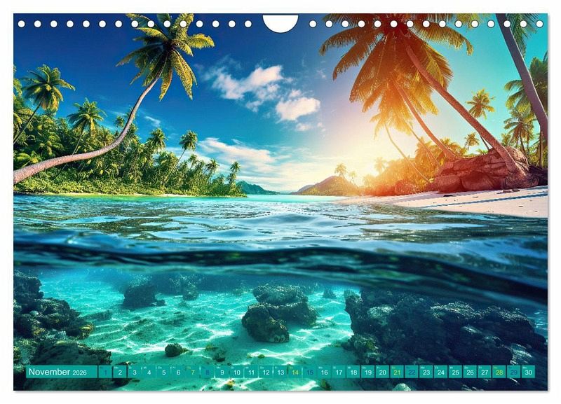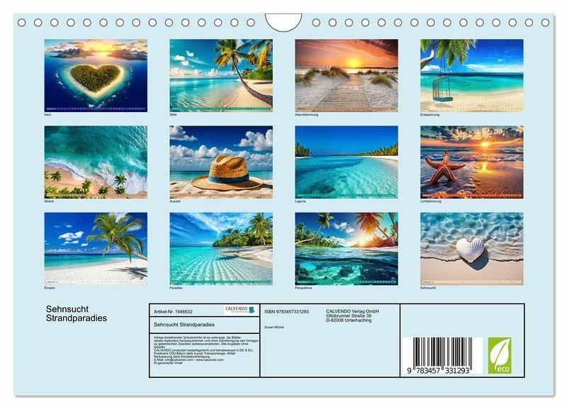 Entfliehe dem Alltag und finde deine Ruheoase im Sehnsucht Strandparadies. Ein Ort, wo das Rauschen der Wellen deine Sorgen hinfortträgt und die Sonne deine Seele wärmt. Genieße unvergessliche Momente am goldenen Sandstrand, während das türkisblaue Meer dich in seinen Bann zieht. Erlebe die pure Entspannung und entdecke das Paradies, nach dem du dich sehnst. Willkommen im Sehnsucht Strandparadies - dein Rückzugsort für unvergessliche Erinnerungen. Dieser Kalender wurde mit Unterstützung der KI erstellt.
