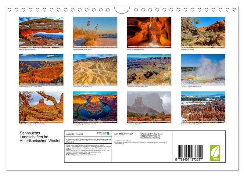 Die Landschaften des amerikanischen Westens sind weltbekannt. Jeder kennt sie aus den unzähligen Filmklassikern oder von seinen eigenen Reisen. Die Aufnahmen von Dieter-M. Wilczek - Erlebnisfotograf und sehr naturverbunden - zeigen die faszinierende, landschaftliche Vielfalt in 12 aussagekräftigen Kalenderbildern.