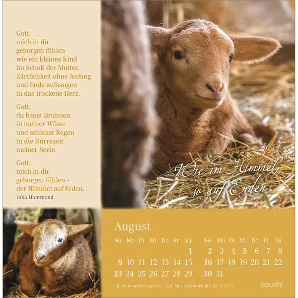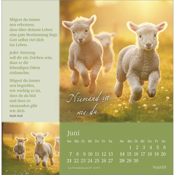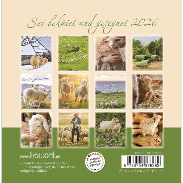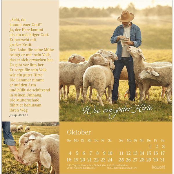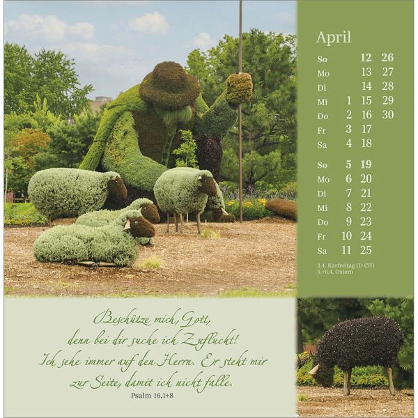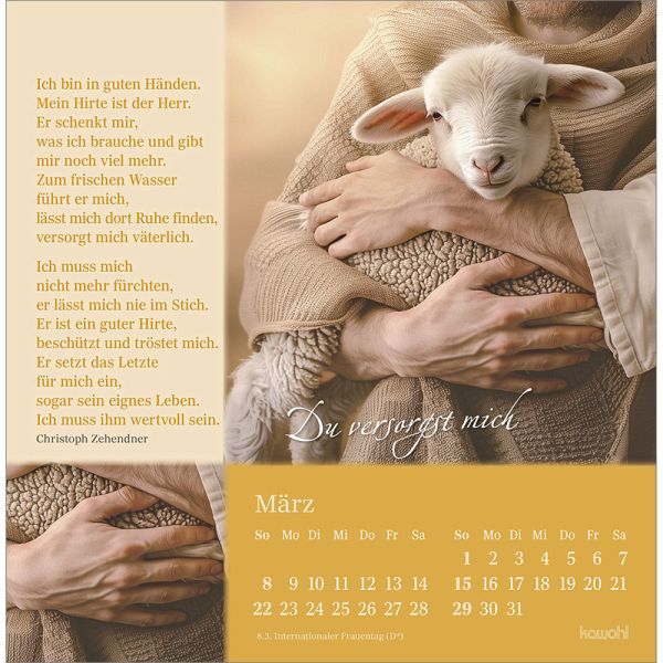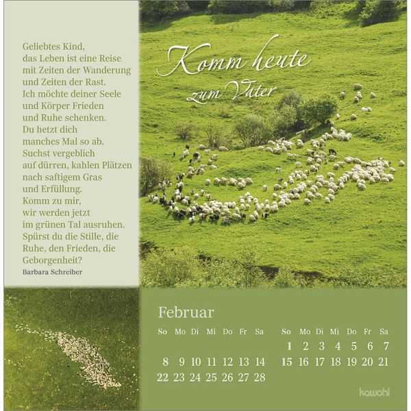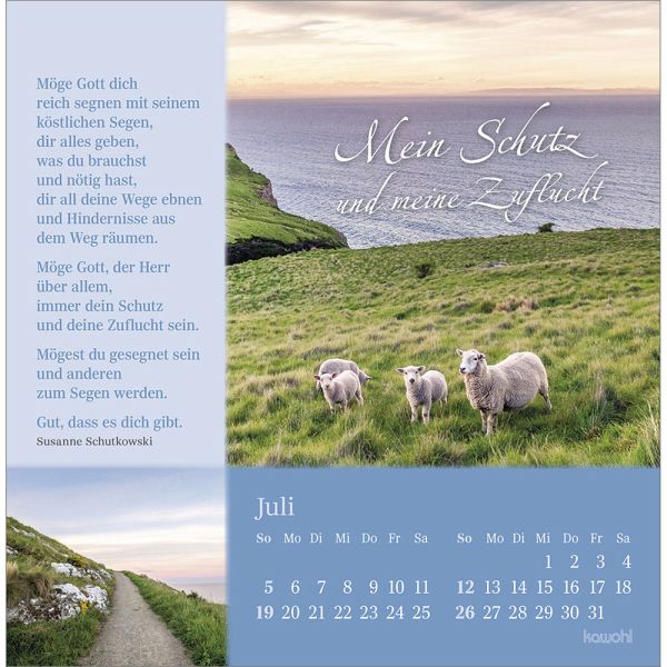 Postkartenkalender mit Impulsen und Gedanken zu Psalm 23Wohltuend wie Balsam wirken die Texte und Bilder und stärken Ihr Vertrauen in Gottes unendliche Liebe. Lassen Sie sich von Impulsen voller Trost, Zuspruch und Geborgenheit berühren und schöpfen Sie Zuversicht für Ihren Weg durch das Jahr.Postkarten-Kalender:- Texte zu Psalm 23- Motive mit Schafen- Postkartenkarton, Aufsteller, Spiralbindung